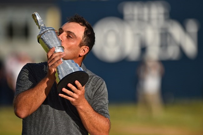 Italy’s Francesco Molinari kisses the trophy as he poses for pictures with the Claret Jug, the trophy for the Champion golfer of the year after winning the 147th Open golf Championship at Carnoustie, Scotland on July 22, 2018. / AFP PHOTO / Glyn KIRK