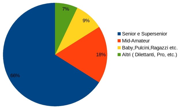 Per aiutarci a capire il mercato dei ” consumers ” italiani proviamo a valutarne la composizione per età. La realtà mostra come il Golf ” nostrano ” sia costituito da una base puttosto monolitica di praticanti che, se analizzata per classi di età, si sintetizza nel grafico a lato dove la parte del leone appartiene ai Senior e Supersenior con una incidenza del 66% sul totale.